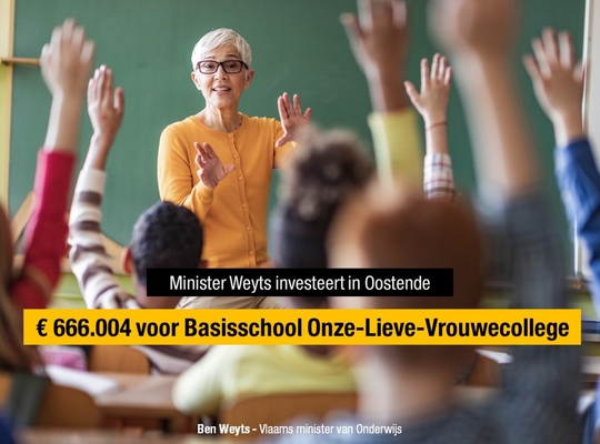 Vlaams minister van Onderwijs Ben Weyts (N-VA) investeert € 666.004 in Vrije Basisschool - Onze-Lieve-Vrouwecollege in Oostende. “Kwaliteitsvol onderwijs vraagt kwaliteitsvolle onderwijsinfrastructuur”, zegt Vlaams minister van Onderwijs Ben Weyts.